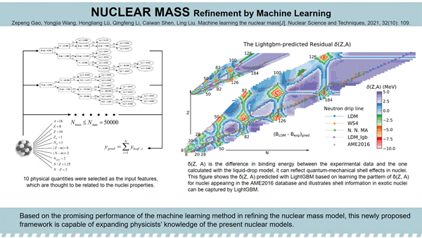 原子核质量是原子核最基本的性质,对于理解基本相互作用和元素起源等科学问题具有重要意义。然而,由于原子核的复杂性,目前对原子核质量的理论预言仍面临困难和挑战。李庆峰教授团队将机器学习方法应用于核物理问题的研究,通过对机器学习模型的泛化能力和可解释性进行细致分析,展示了机器学习在从核物理相关数据中挖掘关键信息方面的强大能力。该团队利用机器学习中的LightGBM决策树方法,通过学习原子核质量模型的理论值与实验值的残差,优化了质量模型,取得了当时最高精度的原子核质量预测结果。同时,团队还对模型的外推能力、可解释性分析、不确定性量化、新幻数探索、中子分离能以及中子滴线预位置等一系列热点问题进行了详细讨论。