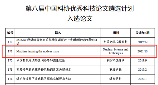 近日,中国科学技术协会公布了第八届中国科协优秀科技论文遴选计划结果,我校李庆峰、王永佳教授团队的《Machine learning the nuclear mass》成功入选。这是我校首篇入选该奖项的论文,也是历届优秀科技论文中首篇核物理理论相关的论文。