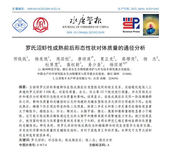 该入选论文是水产专业2022届毕业生邢钱钱在校期间于2022年发表在《水产学报》第46卷第9期上的研究成果,生命科学学院研究员唐琼英和杨国梁为共同通讯作者。该研究随机选取人工养殖的罗氏沼虾1106尾,对其体质量、全长和体长等15个性状进行测量,并采用相关分析和通径分析阐明形态性状对体质量的影响,最后确定影响各群体体质量的关键性状。研究表明将罗氏沼虾的性成熟状态和雌雄群体的优良表型作为选育依据,并有效利用影响体质量的关键性状指标,有利于其选育工作的开展。