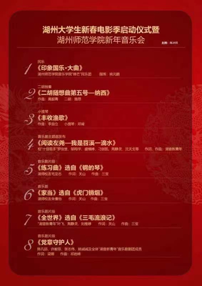 为进一步浓厚我市电影氛围,让更多的青年群体了解电影、热爱电影、参与电影,同时展示我校音乐戏剧工作者的精神风貌,拟举办“湖州大学生新春电影季暨湖州师范学院新年音乐会”,具体通知如下: