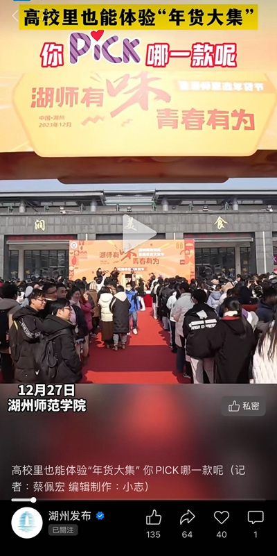 2023年12月27日,湖州发布报道我校开展首届美食文化节暨湖师惠选年货节。具体如下:
