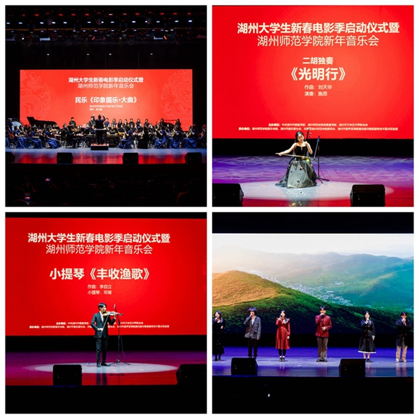 电影季启动仪式结束后,举行了湖州师范学院新年音乐会。音乐学院“锋芒”民乐团带来的民乐《印象国乐·大曲》以传统民乐曲目为基础,融入现代音乐元素,展现了中国民乐的独特魅力。具有浓郁民族风格的二胡独奏《光明行》带观众走近光明的音乐世界。小提琴《丰收渔歌》以欢快的旋律和生动的节奏,展现了渔民们丰收的喜悦场景。音乐剧主题曲《阅读左尧——我是苕溪一滴水》展现了湖州历史文化名人沈左尧先生的生平事迹和精神风貌。沈左尧先生的夫人封圣华女士到场为师生送上了祝福。湖师校友毛定志带来的音乐剧片段《练习曲》选自《钢的琴》,展现了工人阶级的奋斗精神和生活情感。湖师校友朱憬怡带来的音乐剧片段《家当》选自《虎门销烟》,展现了中国人民的爱国精神和民族自豪感。“湖音新青年”社团带来的音乐剧片段《全世界》选自《三毛流浪记》,展现了流浪儿童的苦难和坚强。我校“白天鹅”奖获奖作品、湖州市精神文明建设“五个一工程奖”获奖作品、国家艺术基金资助项目、建党百年受邀进京公演的原创音乐剧《党章守护人》展现了工人领袖和学生的爱国情怀,现场演出片段将气氛推向了高潮。