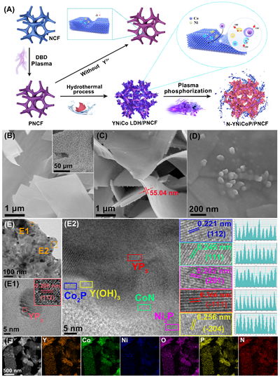 针对以上难题,陈光良教授团队首次提出一种利用微量稀土金属钇(Y)和等离子体处理来提高碱性电解条件下的电催化活性和稳定性的新方法。该方法首先通过介质阻挡放电(DBD)等离子体对镍钴合金泡沫(NCF)进行改性,在NCF表面形成微观纳米缺陷;然后在等离子体处理过的NCF(PNCF)表面原位水热生长出光滑的钇掺杂镍钴层状双氢氧化物纳米片(YNiCo LDH/PNCF);最后,在氮气中利用射频等离子体进行磷化处理,得到钇和氮掺杂磷化镍钴纳米片状电催化剂(N-YNiCoP/PNCF)。得到的N-YNiCoP/PNCF具有较大的比表面积、丰富的异质界面和优化的电子结构,在1M KOH电解液中的HER(331 mV vs. 2000 mA cm-2)和OER(464 mV vs. 2000 mA cm-2)反应中具有较高的电催化活性。X射线吸收光谱(XAS)和DFT量子化学计算表明,随着Y原子的加入,CoNi的配位数减少,从而使Ni离子和Co离子的键更短,实现了N-YNiCoP在模拟工业条件下HER和OER反应中的长运行稳定性。同时,等离子体N掺杂形成的CoN-YP5异质面是整个水分裂的活性中心。这项工作拓展了稀土元素在双功能电催化剂中的应用,为可再生能源领域设计高性能过渡金属基催化剂开辟了新方向。