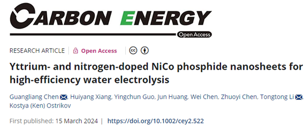 近日,我校工学院材料工程系陈光良教授(第一作者兼通讯作者)以我校为第一单位在材料科学领域国际著名期刊《Carbon Energy》(中科院一区TOP,IF:20.5)上,发表题为“Yttrium‐ and nitrogen‐doped NiCo phosphide nanosheets for high‐efficiency water electrolysis”的研究文章。