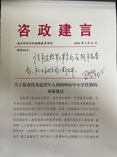 近期,继续教育学院报送的《关于促进优秀退役军人到湖州市中小学任教的对策建议》信息获副市长夏坚定批示。