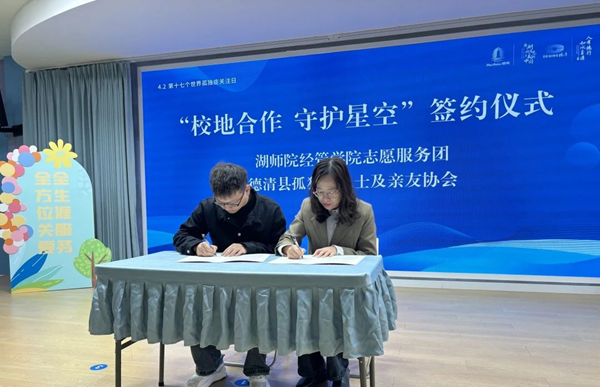3月28日上午,德清县“世界孤独症关注日”活动暨全省首家县级孤独症“星希望”护翼专项基金成立仪式在康乾街道浙江工业大学附属秋山幼儿园举行。我校经济管理学院关爱孤独症儿童志愿服务团志愿者代表受邀参加,并与德清县孤独症人士及亲友协会签订了关于“校地合作 守护星空”友好共建的协议。此次协议主要围绕辅导培训、融合康复活动以及暑期夏令营专项活动等内容展开,积极践行本次孤独症日“全生涯服务 全方位关爱”的活动主题,为孤独症儿童及家庭提供提供暖心支持和帮扶。