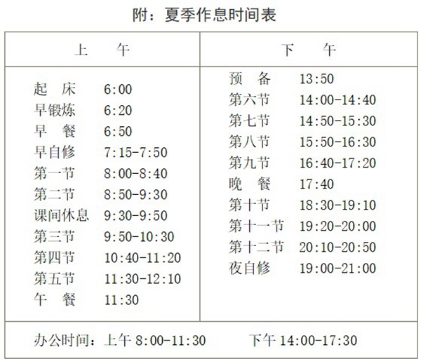 根据学校作息时间安排,自5月6日(星期一)开始实行夏季作息时间表,请各单位做好通知工作,确保调整作息时间后学校各项工作正常有序开展。