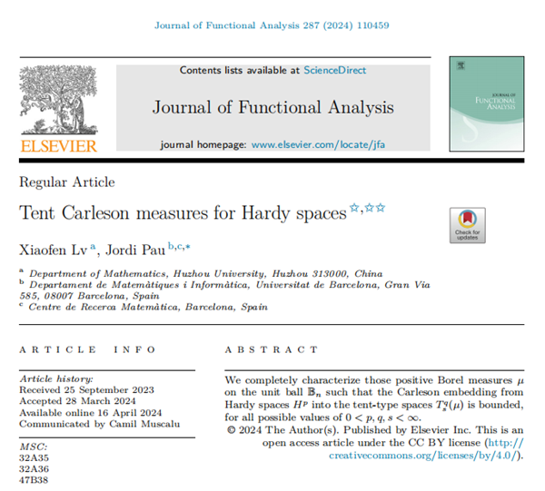 近日,我校理学院多复变研究团队成员吕小芬教授(第一作者)与巴塞罗那大学Pau Jordi教授合作,在分析学领域国际顶级学术期刊《Journal of Functional Analysis》发表了题为“Tent Carleson measures for Hardy spaces”的学术论文。该文利用调和分析的方法,彻底解决了多复变全纯Hardy空间到帐篷空间上嵌入算子的有界性问题,为进一步研究这类函数空间上相关算子的特性提供了新的研究方法。该研究工作得到了国家自然科学基金面上项目的资助,我校为第一完成单位。