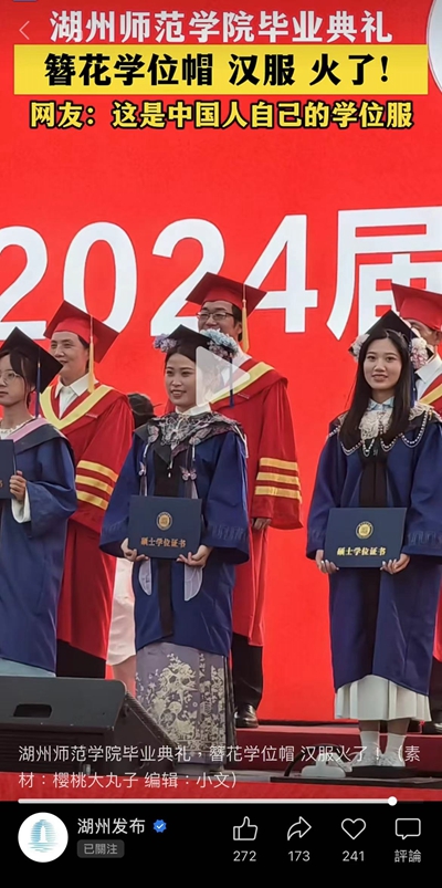 2024年6月20日,湖州发布报道我校毕业典礼上,毕业生戴簪花学位帽、着汉服。具体如下: