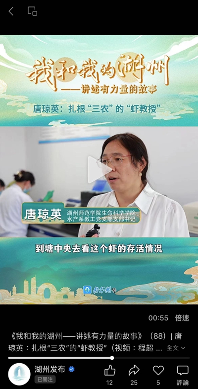 2024年7月1日,湖州发布报道我校生命科学学院水产系副主任、教工党支部书记唐琼英潜心教学科研的故事。具体如下: