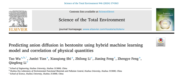 近日,我校工学院材料科学与工程系伍涛教授(第一和通讯作者)以我校为第一单位在化学领域知名期刊《Science of the Total Environment》(中科院一区TOP,IF:8.2)上,发表题为 “Predicting anion diffusion in bentonite using hybrid machine learning model and correlation of physical quantities” 的研究文章。