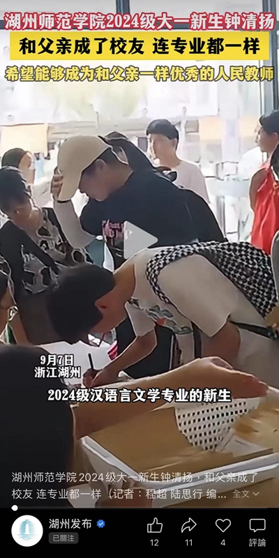 2024年9月7日,湖州发布报道我校2024级新生钟清扬与她的父亲成为了校友。具体如下: