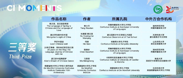 其中,我校公派教师陈晓珍创作的《20年正青春:我和他们的汉语之旅》、志愿者教师杨小丹创作的《春之语,是汉语是情语》分别获三等奖;孔院学员赵晨阳(Bunyatov Kamil)凭借作品《春之语,是汉语是情语》,获评“孔院达人”称号。除个人奖项外,阿塞拜疆语言大学孔子学院还荣获“优秀组织奖”。