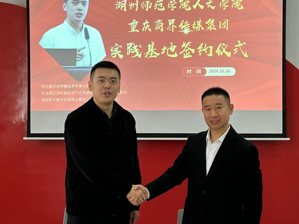 10月30日,作为中国最具影响力的财经媒体经营集团之一的重庆商界传媒集团,与我校人文学院正式签署了《湖州师范学院合作建设校外教学实践基地协议》及《湖州师范学院硕士研究生实践基地共建协议》。商界传媒集团青年事业部董事总经理祖雪蛟、我校人文学院院长夏德靠和传播系全体教师共同参加了本次活动。