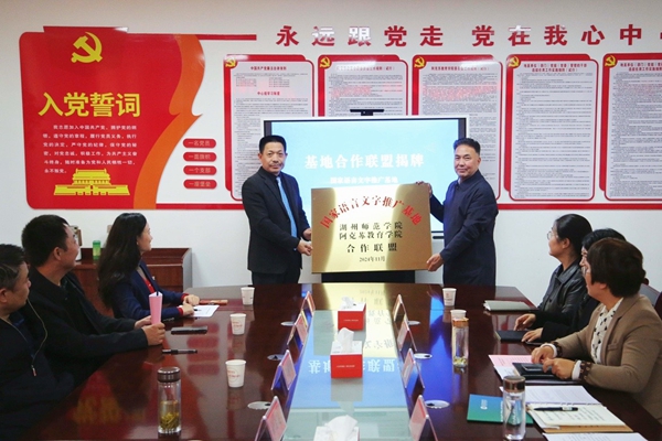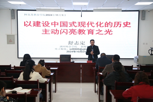 在阿克苏教育学院,舒志定看望了援疆教师孙米莉和马进,举行了国家语言文字推广基地共建联盟授牌仪式,并为全体教师做了题为《以建设中国式现代化的历史主动闪亮教育之光》的主旨报告。