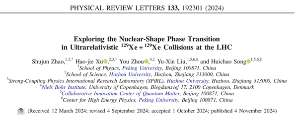 近日,我校理学院物理学科徐浩洁副研究员与北京大学和哥本哈根大学玻尔研究所的合作者在物理学顶级期刊《物理评论快报》(Physical Review Letters,PRL)上发表题为“Exploring the Nuclear Shape Phase Transition in Ultra-Relativistic 129Xe+129Xe Collisions at the LHC”的学术论文。论文的第一作者为我校联合指导的北京大学博士生赵沭钧同学,徐浩洁老师是共同通讯作者。本工作得到国家自然科学基金项目的资助。