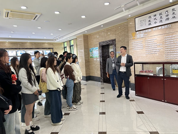 企业负责人带领同学们参观了阿祥重工的厂房,了解工厂主营业务与自主研发并且申请专利的滚齿机等设备。通过一则短片,同学们了解集团的创业历程,了解其超前的科研意识与拼搏责任的企业精神。?座谈会上,企业负责人结合创业经历,鼓励广大同学多关注新闻与实时政策。同时,他鼓励同学们掌握至少两门语言,增强贸易技能,用自己的信心去战胜学习、就业道路上的挑战。