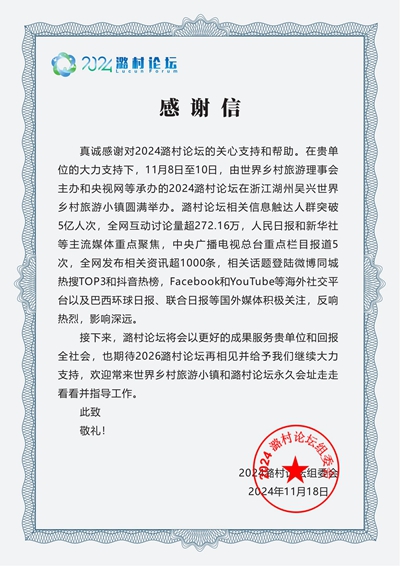 近日,2024潞村论坛在浙江湖州成功举办。本次论坛由世界乡村旅游理事会主办,中央广播电视总台央视网、浙商银行股份有限公司、浙江外国语学院、浙商总会金融服务委员会、浙江乡村旅游研究院等共同承办,旨在通过金融助力乡村振兴,共谋发展新路。来自全球40多个国家和地区的300余名嘉宾齐聚一堂,围绕“金融助力乡村振兴”主题交流互鉴。外国语学院组成师生志愿者21人,助力此次论坛的各项活动,为论坛的顺利进行提供了重要支持。