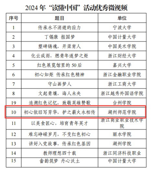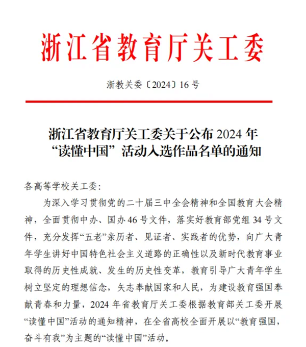 近日公布的《浙江省教育厅关工委关于公布2024年“读懂中国”活动入选作品名单的通知》(浙教关委〔2024〕16号),我校关工委选送的由医学院、护理学院刘晟、姜艳霞等学生制作的作品《初心依旧写芳华,护之薪火永相传——记第35届南丁格尔奖章获得者邹瑞芳》获省教育厅关工委2024年“读懂中国”活动优秀微视频奖,学校关工委获省教育厅关工委2024年“读懂中国”活动表扬单位。