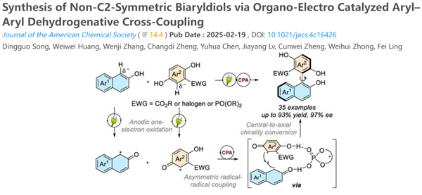 近日,我校生命科学学院药学系青年教师宋定国以第一作者身份在国际著名学术期刊《J. Am. Chem. Soc.》(中科院一区TOP,IF = 14.4)上发表题为“Synthesis of Non-C2-Symmetric Biaryldiols via Organo-Electro Catalyzed Aryl–Aryl Dehydrogenative Cross-Coupling”的研究成果,论文通讯作者是浙江工业大学药学院钟为慧教授和凌飞副教授。