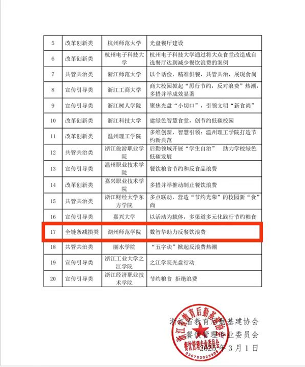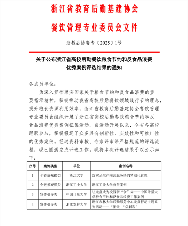 近日,浙江省高校后勤餐饮粮食节约和反食品浪费优秀案例评选结果揭晓,有20项案例入选。我校后勤服务中心申报的《数智华助力反餐饮浪费》案例成功入选全链条减损类案例,该类型案例全省仅3项。此次评选旨在为深入贯彻落实国家关于粮食节约和反食品浪费的重要指示精神,积极推动我省高校后勤餐饮领域践行节约理念,提升粮食资源利用效率。