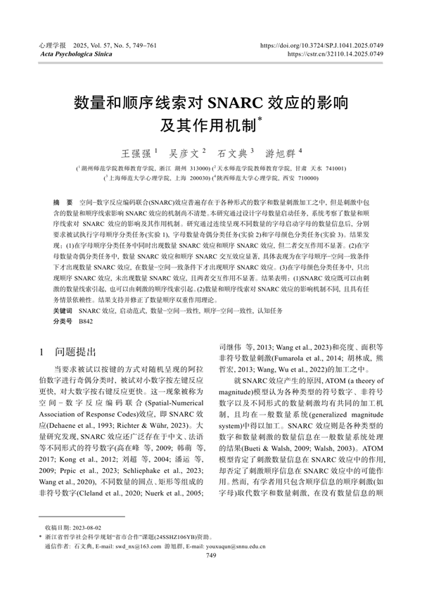 近日,我校教育学院(教师教育学院)王强强副教授以第一作者身份在中文权威期刊《心理学报》上发表题为《数量和顺序线索对SNARC效应的影响及其作用机制》的学术论文。