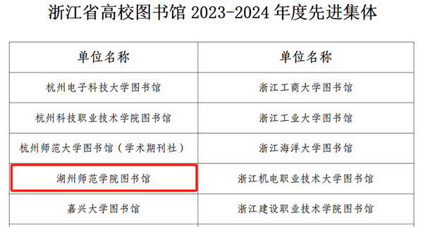 近日,浙江省高等学校图书情报工作指导委员会公布了2023-2024年度全省高校图书馆先进集体及先进个人名单,我校图书馆喜获浙江省“高校图书馆先进集体”称号。该荣誉每两年评选一次,是全省高校图书馆界重要的荣誉表彰。