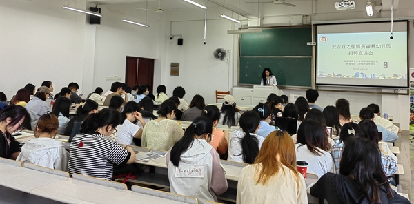 4月11日上午,教育学院在东校区32-419举办安吉百之佳博苑森林幼儿园专场招聘宣讲会,学前教育专业140余名学生参加,北京博苑教育集团人事负责人王宁到场做招聘宣讲。