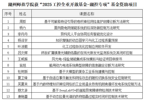 近日,工业控制技术全国重点实验室(以下简称“工控全重”)公布了“2025工控全重开放基金-湖控专项”基金评审结果,共有25个课题被立项资助,我校有13个项目名列其中。