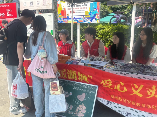 活动现场充满新意:缤纷的海报、整齐的物资、创意造型门与互动游戏相映成趣,火红的横幅在微风中轻舞。教育学院的学生志愿者们手捧募捐箱、分发倡议书,向路过的市民们介绍“走进教育第一线”志愿服务品牌、“织里陪伴家+”志愿服务项目,每一份善款都将化作爱心物资,温暖湖州随迁子女的心田。这群青年志愿者正以实际行动诠释责任担当,为共建“美丽湖州”贡献青春力量。