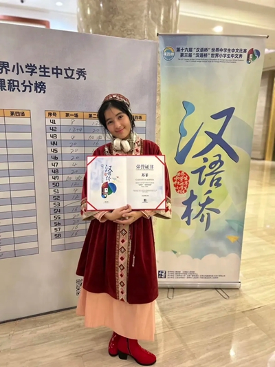 苏菲自踏上汉语桥决赛的征程伊始,就感受到了当地师生的热情。凭借对京剧无比的热爱和精湛演出,她从北京长城上的引吭高歌,再到大理一中的惊艳亮相,一举斩获本届汉语桥决赛“最佳风采奖”,并因为出色的扮相,受电视台特别邀约出席颁奖典礼的戏腔独唱。教育部副部长、国家语言文字工作委员会主任陈杰出席仪式,为中、小学生全球总冠军颁奖并致辞。他在致辞中特别提及阿塞拜疆选手苏菲,认为苏菲作为年纪最小的京剧爱好者,生动演绎了自己的花旦角色,肯定了她和家人对中国文化的支持和追求,希望苏菲未来能够实现“京剧梦”,开辟人生新通道。