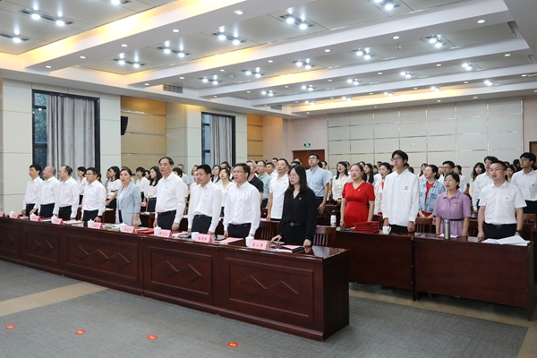 面向鲜红的党旗,校党委书记许慧霞带领师生党员重温入党誓词。