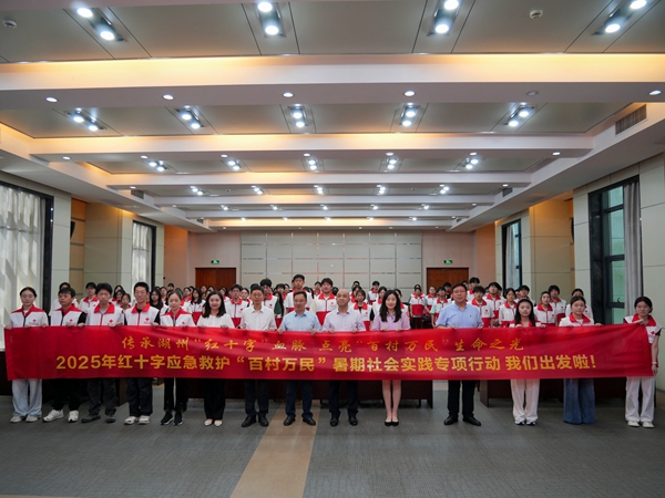 6月28日上午,我校举行“传承湖州‘红十字’血脉 点亮‘百村万民’生命之光”——2025年红十字应急救护“百村万民”大学生暑期社会实践专项行动启动仪式。湖州市红十字会党组副书记、专职副会长沈维勇,湖州银行党委委员、监事长丁颂辉,我校医学院(护理学院)党委书记甘顺良、团委副书记(主持工作)成晓、党委宣传部副部长许莹莹、医学院(护理学院)党委副书记董建新,以及100多名大学生志愿者参加本次活动。仪式由董建新主持。