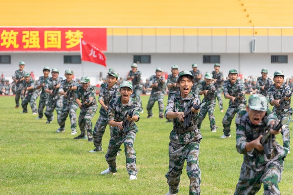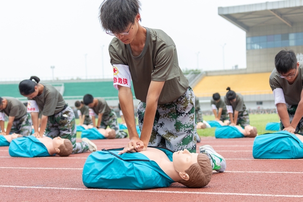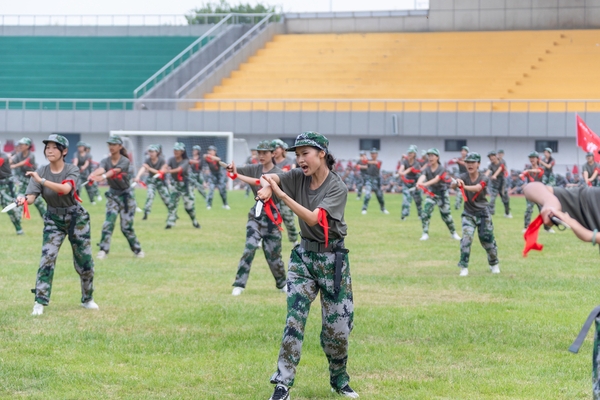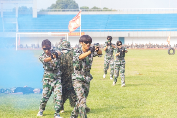 特色科目展演环节,十四营医学院学生化身“生命守护者”,以规范动作演示心肺复苏、止血包扎、骨折固定与伤员搬运等应急救护技术,生动传授急救技能,将人道主义精神与医者责任感深植于心。四营教育学院(教师教育学院)和二营经济管理学院的225名女兵带来的匕首操表演,用整齐划一的动作、清脆嘹亮的口号,完美诠释了刚柔并济之美,展现了当代女大学生自信自强、勇于挑战的风采。来自十一营信息工程学院的132名学生带来了紧张激昂的战术表演,表演贴近实战,通过翻滚、跃进、掩护、射击等动作的组合,模拟战场环境,动作逼真,配合默契,展现了良好的战术素养和团队精神。虽然训练艰苦,但十营理学院的100名同学不畏艰难,手握模拟枪、有力突刺,展示了培养军人血性胆气和近战能力的传统课目——刺杀操,展现出勇往直前的战斗精神和一往无前的豪迈气概。
