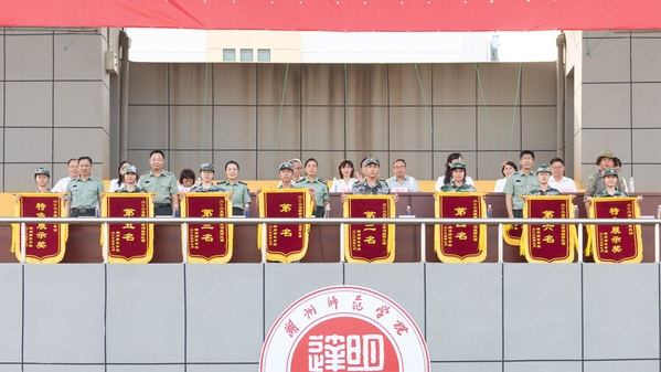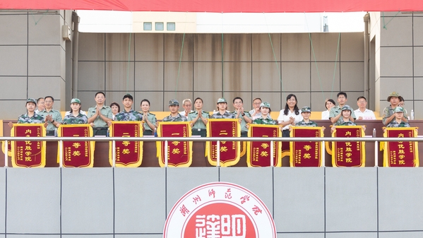 丁敢真宣读军训各类奖项获奖名单。其中先进个人349名、文明寝室177间;优秀组织奖4个,优秀方阵6个,内务优胜学院3个,拔河比赛获奖学院6个,特色展示奖2个,精神风貌奖4个。主席台领导为获奖集体代表颁奖。