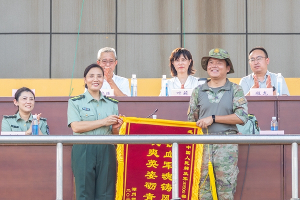 许慧霞向军训教官和教导员代表赠送荣誉奖章,向承训部队赠送锦旗。她代表学校向承训部队表示感谢,向从事军训组织和保障工作的各位老师致以诚挚问候,向2025级全体新生表示祝贺。她指出,军训不仅是大学的“开学第一课”,更是青年学子人生路上的“成长淬炼营”。她殷切寄语新生:愿大家在未来四年里,始终保持热忱、勇敢追逐梦想,实现从“会读书的人”到“会创造的人”的蜕变,最终成长为“胸有大爱、本领过硬、团结包容”的湖师新青年,在青春的赛道上跑出属于自己的精彩。