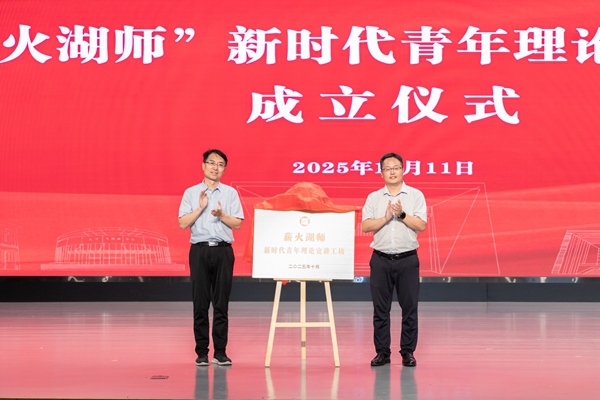 湖州市委宣传部、校党委宣传部相关负责人共同为“薪火湖师”新时代青年理论宣讲工坊揭牌。