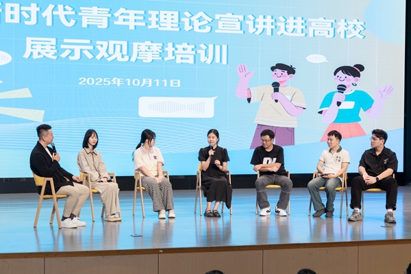在“青年宣讲如何有理有趣”现场互动交流环节,宣讲员代表、学生代表与主持人围绕宣讲内容选择、表达技巧提升等问题进行了探讨,同时分享了参加本次活动的收获与感悟,现场气氛热烈、金句频出。这一环节有效破解了青年理论宣讲“讲什么、怎么讲”的难题,为我校后续宣讲工作的开展提供了宝贵经验和有力指导。