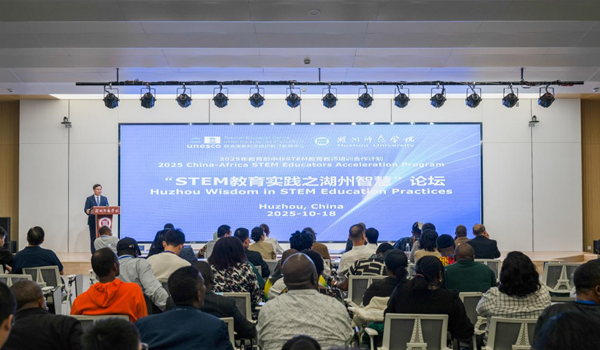 10月18日,教育部中非STEM教育教师培训合作计划“STEM教育实践之湖州智慧”论坛在我校举办。我校副校长楼建林、联合国教科文组织教师教育中心“中非STEM教育教师培训合作计划”负责人宋佳、湖州市教育局副局长施晓红、吴兴区教育局局长朱晨旭出席,我校教务处、国际交流合作处、外国语学院、理学院负责人,湖州市三县两区STEM教研员、师生代表,与来自非洲11个国家近60名教育行政官员、高校学者及中小学教师代表等齐聚一堂,共话中非STEM教育。