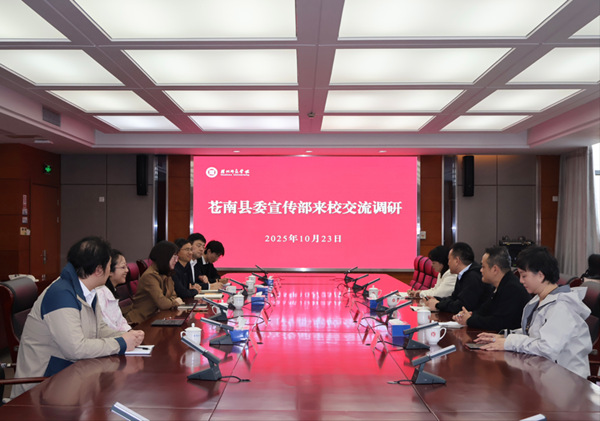 为持续深化合作、优化文化特派员工作机制,10月23日,苍南县委宣传部常务副部长陈国子,苍南县委宣传部副部长、县社科联主席金招辉一行专程回访我校,就省级文化特派员李睿浦老师的工作情况及校地合作深化议题与校方进行座谈。校党委委员、宣传部长朱小芳,音乐学院党总支书记何小勤,音乐学院副院长(主持行政工作)鲁立等参加座谈。