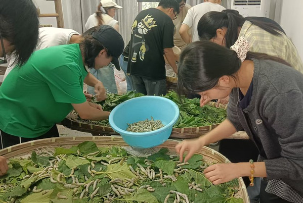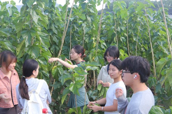 课程初始,在几位老师的带领下,同学们踏入桑园。余连祥老师详细讲解了桑叶采摘的知识与技巧,从桑叶的成熟度判断,到采摘时对桑树的保护,都耐心说明。随后同学们分批次来到桑园,在余老师的指导下,逐渐熟练掌握采摘方法。