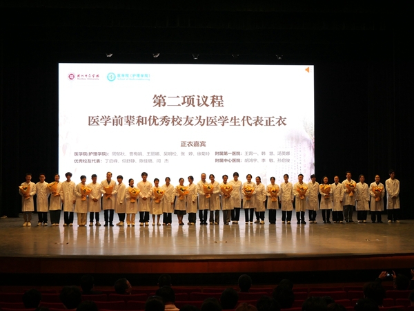 15位来自附属医院的医学前辈、医学院资深教师以及优秀校友代表,共同为2025级医学生代表正衣,并赠予医学生誓言卡,寄托殷切期望。学生代表为15位医学前辈献花。