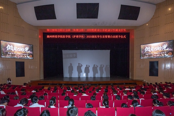 11月12日下午,我校2025级医学生宣誓暨白衣授予仪式在东校区会堂举行。校党委副书记丁敢真,湖州市卫生健康委副书记、副主任胡小军,优秀校友代表,附属第一医院、附属中心医院领导和医护代表,校党委宣传部、学工部、团委等部门负责人,医学院(护理学院)领导班子、系部主任、师生代表、2025级全体医学新生近500人参加。