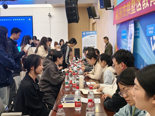 招聘宣讲活动在创新创业中心举行。拱墅区教育局全面解读区域教育发展优势、人才政策及就业环境,各中小学介绍本校教育教学情况及招聘需求,现场气氛热烈,共吸引140余名学生参与本次活动。