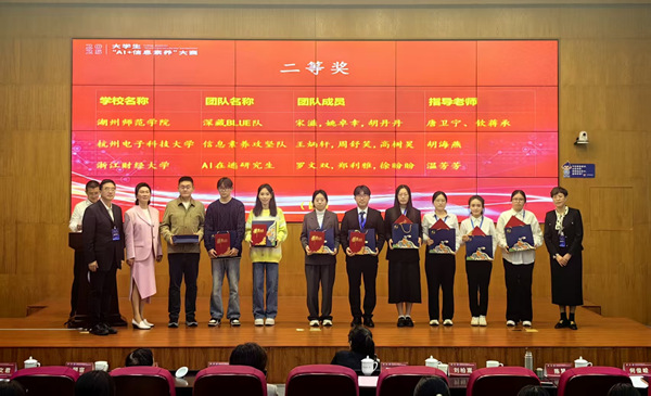 11月15日,由浙江省高等学校图书情报工作指导委员会主办的浙江省大学生“AI+信息素养”大赛暨2025年大学生“AI+信息素养”大赛浙江赛区决赛在杭州电子科技大学落下帷幕。图书馆联合教务处、研究生院积极组织学生参赛,经过校赛、省赛淘汰赛的层层选拔,最终研究生团队“深藏BLUE队”成功晋级省赛决赛,并在激烈角逐中脱颖而出,荣获研究生组二等奖,名列省内硕士点高校第一名。唐卫宁教授与钦蒋承老师作为该团队的指导教师,荣获“优秀指导教师奖”,校图书馆荣获“优秀组织奖”,展现了图书馆“AI+信息素”教育教学能力和竞赛组织能力。