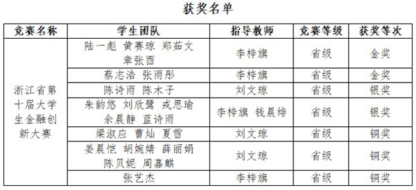 近日,第十届浙江省大学生金融创新大赛于温州商学院圆满落幕。在本届大赛中,我校代表队表现优异,共斩获金奖2项、银奖2项、铜奖3项。本届赛事吸引了来自全省57所高校的积极参与,累计提交作品达815件。竞赛设置金融创新产品设计、金融案例分析、金融创新论文等多个赛道,经过层层选拔与激烈角逐,最终在本科及研究生赛道中共评选出金奖67项、银奖100项、铜奖166项。