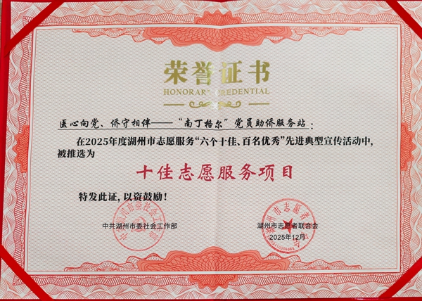 12月2日,在第40个国际志愿者日来临之际,湖州市举行“12·5”国际志愿者日暨2025年度湖州市志愿服务先进典型宣传活动。我校“医心向党、侨守相伴--‘南丁格尔’党员助侨服务站”项目获评湖州市“十佳志愿服务项目”。市委书记陈浩,市委副书记、社工部部长、政法委书记吴智勇,市领导吴伟、沈忠平、邱见春等出席活动。