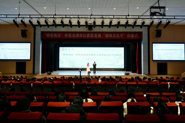 为深入学习宣传贯彻习近平法治思想,传承湖商“诚信务实、经世济民”文化基因,12月8日晚,“明宪致法”杯宪法演讲比赛暨首届湖商文化节闭幕式顺利举行。本次活动由湖州市司法局、市普法办、校党委宣传部与经济管理学院联合主办,校大学生法律援助中心承办。湖州市司法局党委书记、局长吴宇昕,校党委委员、宣传部部长朱小芳,经济管理学院领导班子出席本次活动。400 余名师生齐聚一堂,共赴法治与文化的青春之约。