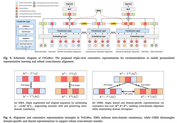 该研究针对联邦跨域推荐系统中普遍存在的数据极度稀疏、非独立同分布(Non-IID)以及差分隐私噪声导致的性能下降等关键挑战,提出了一种全新的联邦跨域点击率预测框架——FedTriCTR-LLM。该框架创新性地引入了大语言模型(LLM)驱动的数据增强网络(LLMAugNet),利用大模型的语义知识丰富用户行为序列;同时设计了三视图对比推荐模块(TriCoRec),通过视图内对齐和跨域解耦机制,有效提升了模型在异构数据下的鲁棒性。此外,研究还提出了一种自适应剪裁差分隐私机制(AdaClipDP),在保证严格隐私安全的同时显著降低了噪声对模型精度的影响。实验结果表明,该方法在Amazon和Douban等多个真实数据集上均取得了优于现有最先进基准模型的性能。