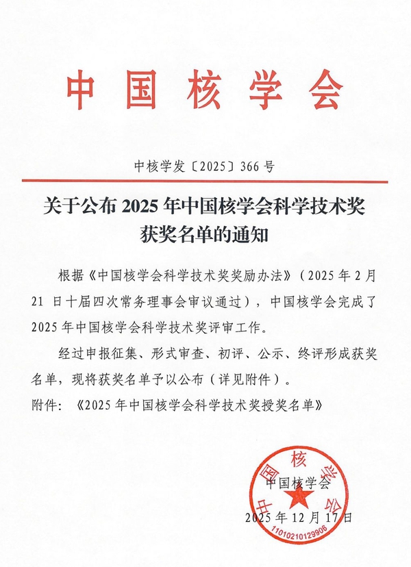 中国核学会成立于1980年,是国家一级学会,由钱三强、王淦昌、朱光亚等老一辈“两弹一星”功勋科学家倡议发起,具有法人资格的全国性、学术性、非营利性的社会团体;是党和政府联系核科学技术工作者的桥梁纽带;是发展我国核科学技术事业的重要社会力量。据悉,中国核学会科学技术奖由中国核学会设立,旨在贯彻实施国家新时代创新驱动发展战略和人才强国战略,奖励在自然科学研究方面、技术发明方面、科技进步方面取得的创新成果,奖励做出突出贡献的单位、个人,激发核科学技术领域优秀人才的积极性和创造性,促进核科技创新与发展。其中,自然科学奖评选聚焦于核科技领域中阐明自然现象、特征和规律并取得重大科学发现的科技成果。本年度,中国核学会共评出自然科学奖5项,其中一等奖1项、二等奖2项、三等奖2项。
